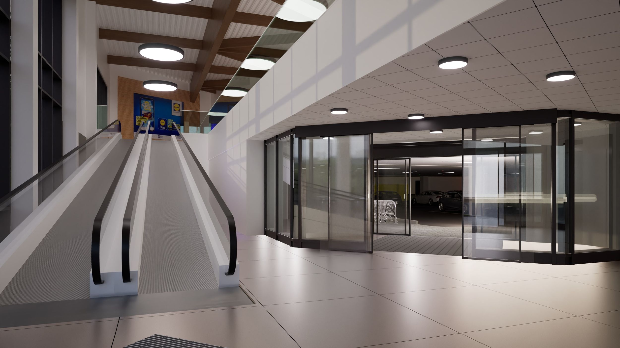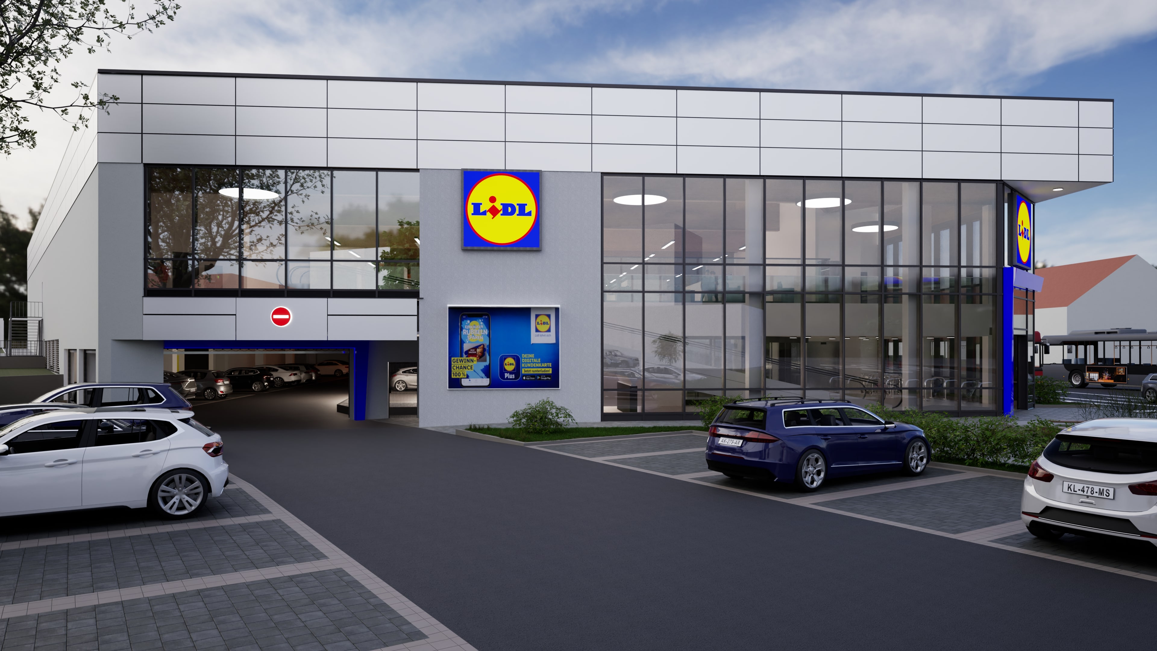 Der architektonische Schlüssel des Projekts liegt in der Verlagerung der Verkaufsfläche ins Obergeschoss. Diese Lösung ermöglicht es, die Parkplätze geschützt im Erdgeschoss unterhalb des Marktes anzuordnen. Dadurch wird die Grundstücksfläche optimal genutzt, kurze Wege für Kunden bleiben erhalten und gleichzeitig entsteht ein kompaktes, funktional überzeugendes Gebäudekonzept.