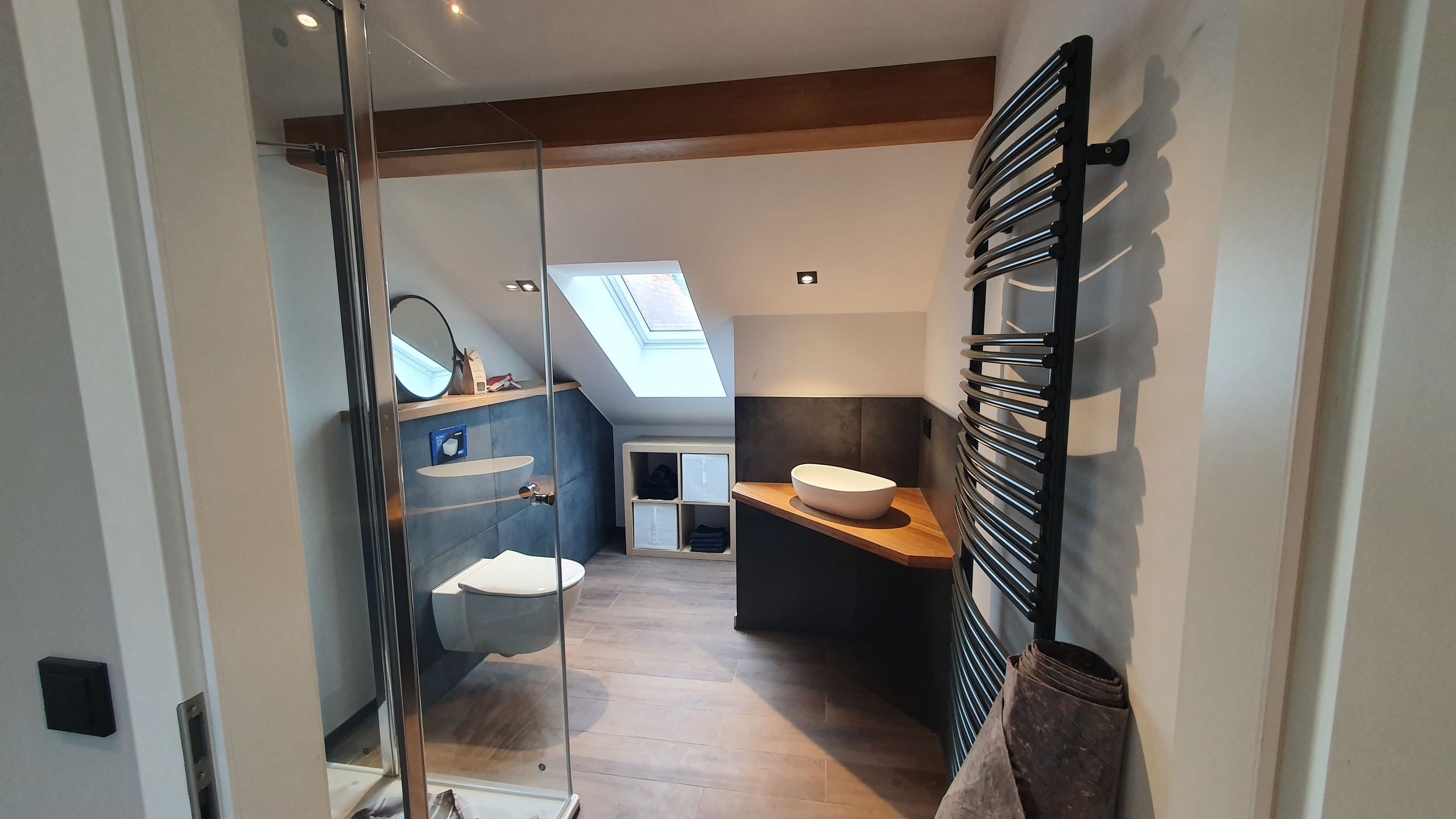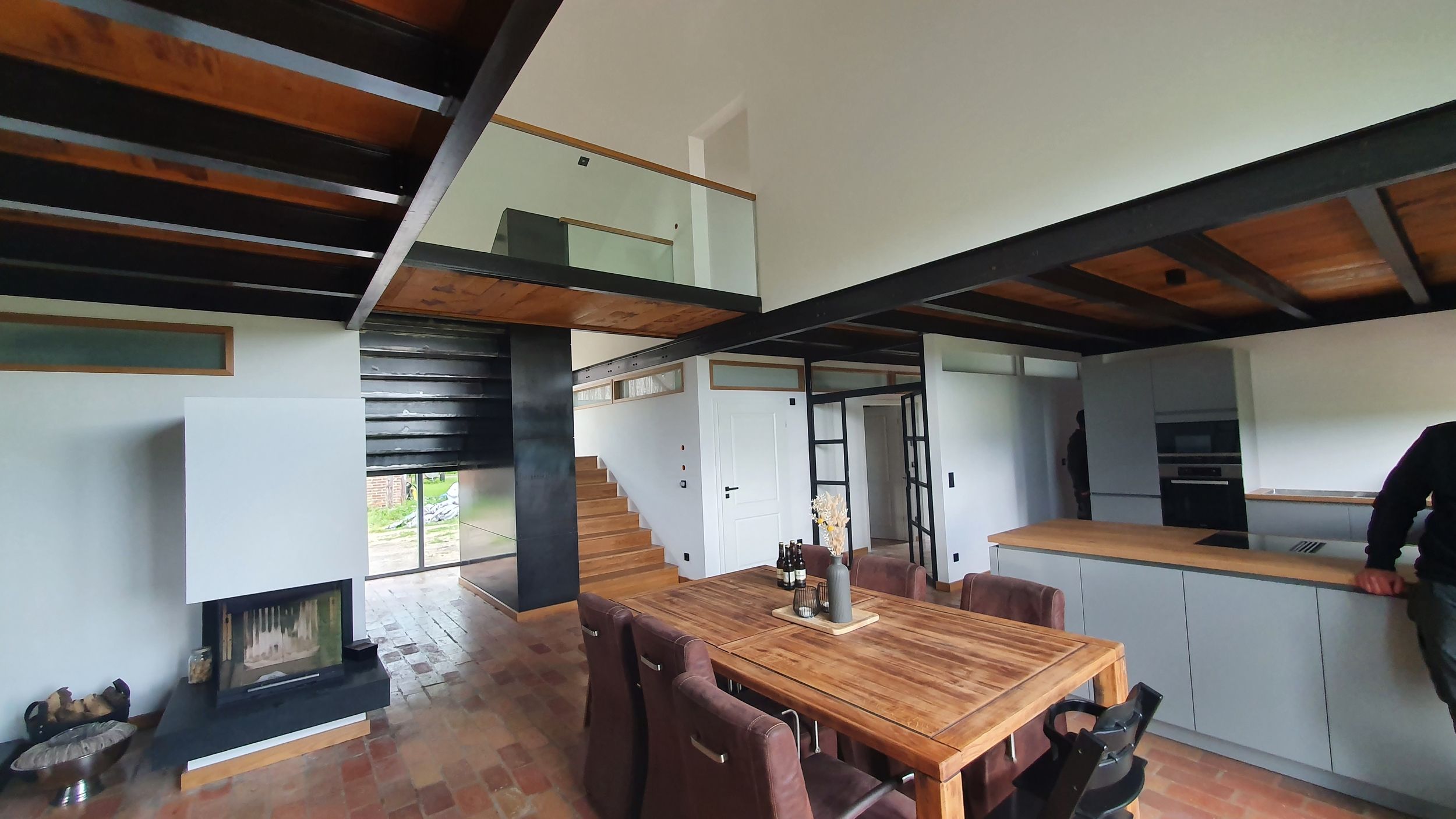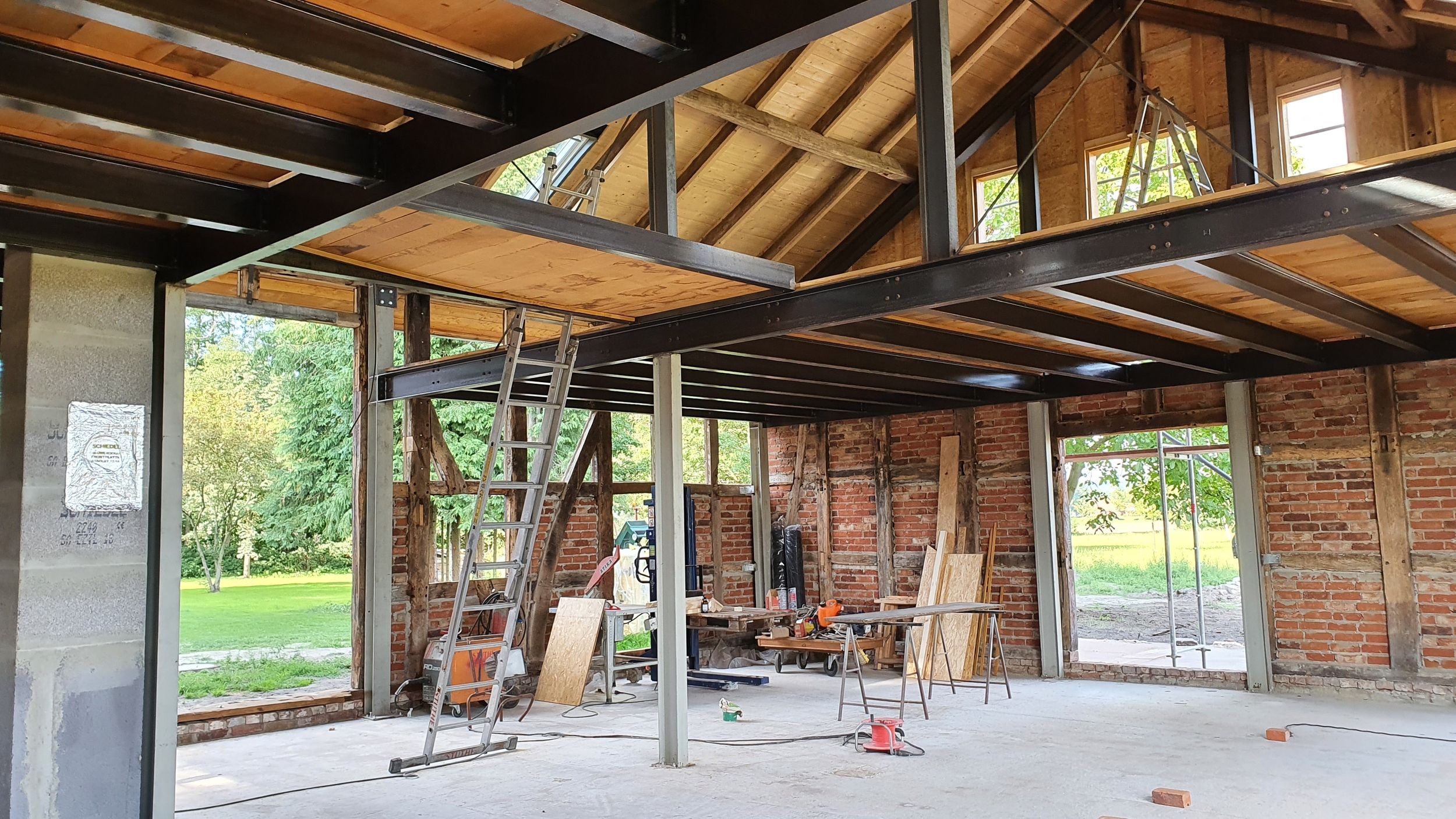 Eine besondere technische Herausforderung und zugleich Kerninnovation des Projekts war der Umgang mit der bestehenden, statisch empfindlichen Gebäudehülle. Um die historische Struktur nicht zu belasten, wurde ein selbsttragendes Innengerüst aus Stahl errichtet. Diese unabhängige Tragkonstruktion bildet die statische Basis des neuen Grundrisses, nimmt sämtliche Lasten auf und trägt das neu ausgebaute Dachgeschoss. So konnte die äußere Fachwerkhülle erhalten bleiben, während im Inneren moderne Wohnstandards umgesetzt wurden.